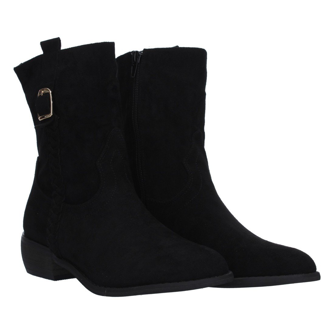 Botín para mujer, estampado liso, trenza en la caña, adorno de hebilla, cierre de cremallera y tacón bajo. Temporada otoño invierno 2023