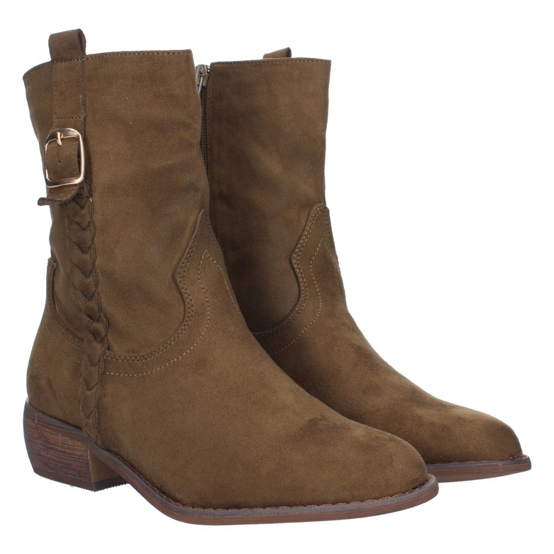 Botín para mujer, estampado liso, trenza en la caña, adorno de hebilla, cierre de cremallera y tacón bajo. Temporada otoño invierno 2023